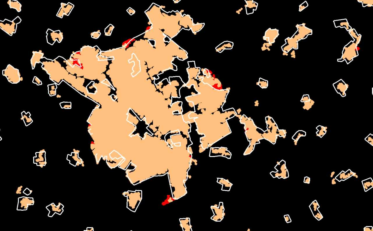 For example, here is our 2012 Milton Keynes in delicate peach with the new 2013 sprawl growth shown in red and the 2013 Merdian2 urban boundary shown as a white line.