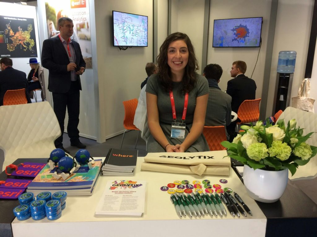 We were unsure what to expect as we walked down the blue carpeted stairs to find our booth in the Innovation Forum. ESRI had representatives from across the globe; USA, Netherlands, Turkey, Sweden, Russia, France, Switzerland, Italy and we were impressed with the range of languages spoken at the booth. Although Sarah and I were restricted to English and some broken French, we met with both UK-based and global companies to talk about how our data, location planning and modelling skills can support their expansion strategies, helping to ensure they open stores in profitable locations. ESRI’s large touchpad of Story Maps really brought things to life, helping to demonstrate the power of visualising and analysing data spatially. I found it encouraging to hear that there were far more data and analytical companies exhibiting this year, illustrating the growing realisation of the importance of harnessing data to drive investment decisions.