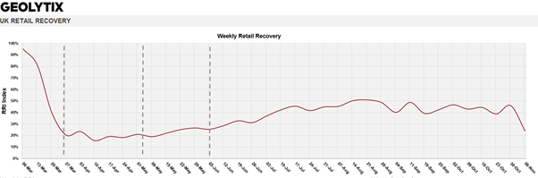 Following hot on the heels of the local Tier 3 lockdown, came National Lockdown 2.0 – and the closure of non-essential retail resulting in a sharp drop – and levels back to those last seen in May: