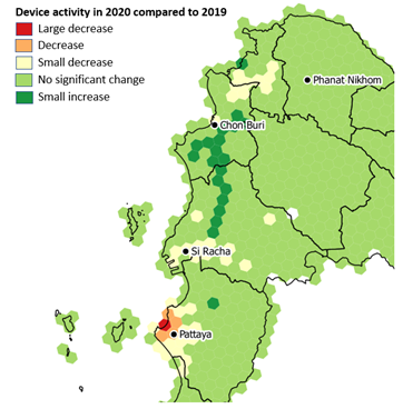 The data reveals that Pattaya has unsurprisingly been hit the hardest in terms of reduction in activity, largely due to international tourist numbers falling to effectively zero. We see a slight increase in domestic visitors to the resort (defined as individuals with a home location greater than 100km away, so including weekend visitors from Bangkok) but far from enough to compensate.