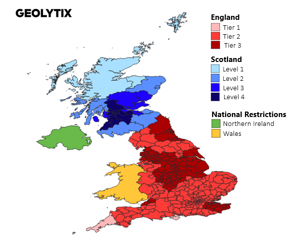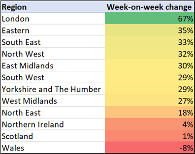 There appears to be a correlation between the regions that have returned from Lockdown - into Tier 3 restrictions, versus those in Tier 2 – although the differences in week-on-week change are perhaps not as pronounced as we might have expected.