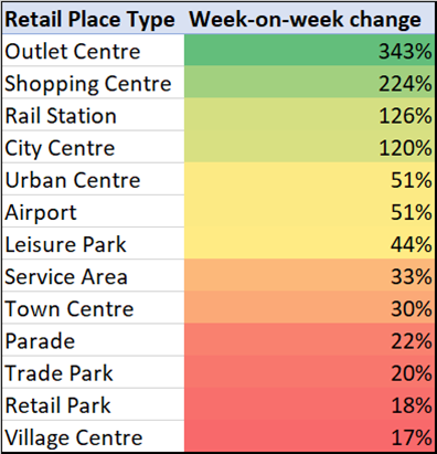 Unsurprisingly, the Retail Places that were entirely closed down by the Lockdown saw the biggest week-on-week jump – Outlet Centres and Shopping Centres.