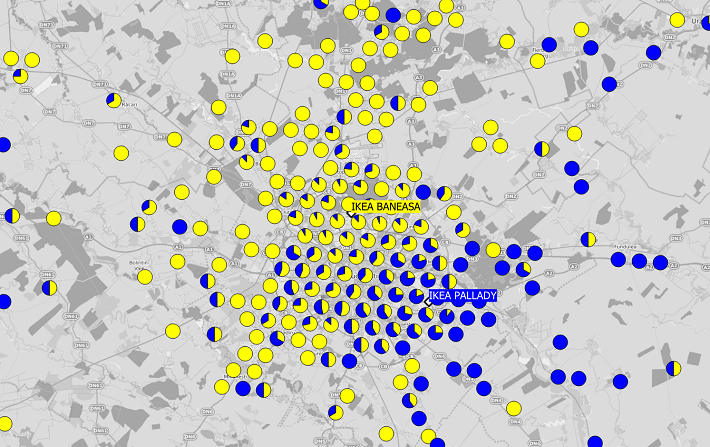 We’ve then visualised this to show the proportion of devices from any given home location area that are seen in Baneasa in Yellow, and Pallady in Blue, giving us an immediate view of catchment extent and, where there are areas with both yellow and blue, overlap.