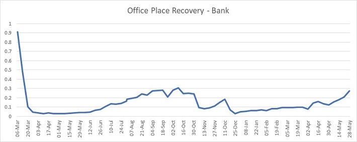 Mapping these, there is interesting variation, with type of Office Work being an obvious differentiator (Banking / Financial Services activity levels in the City very low). The size of organisations, the nature of the buildings and their suitability for socially distanced, covid-safe return of work, and the ability for work to be undertaken away from the office are all factors that will influence the pace and extent of Office Place recovery.
