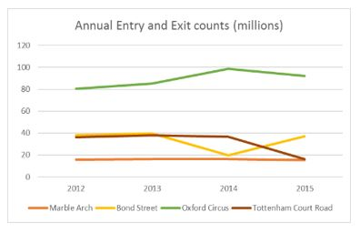 Passenger numbers at the current Oxford Street tube stations have remained fairly constant over the last few years (see graph). Major falls and increases in passenger numbers are accountable to long term station improvements taking place, so Crossrail impacts should be clear to see once the line starts running through central London in December 2018.