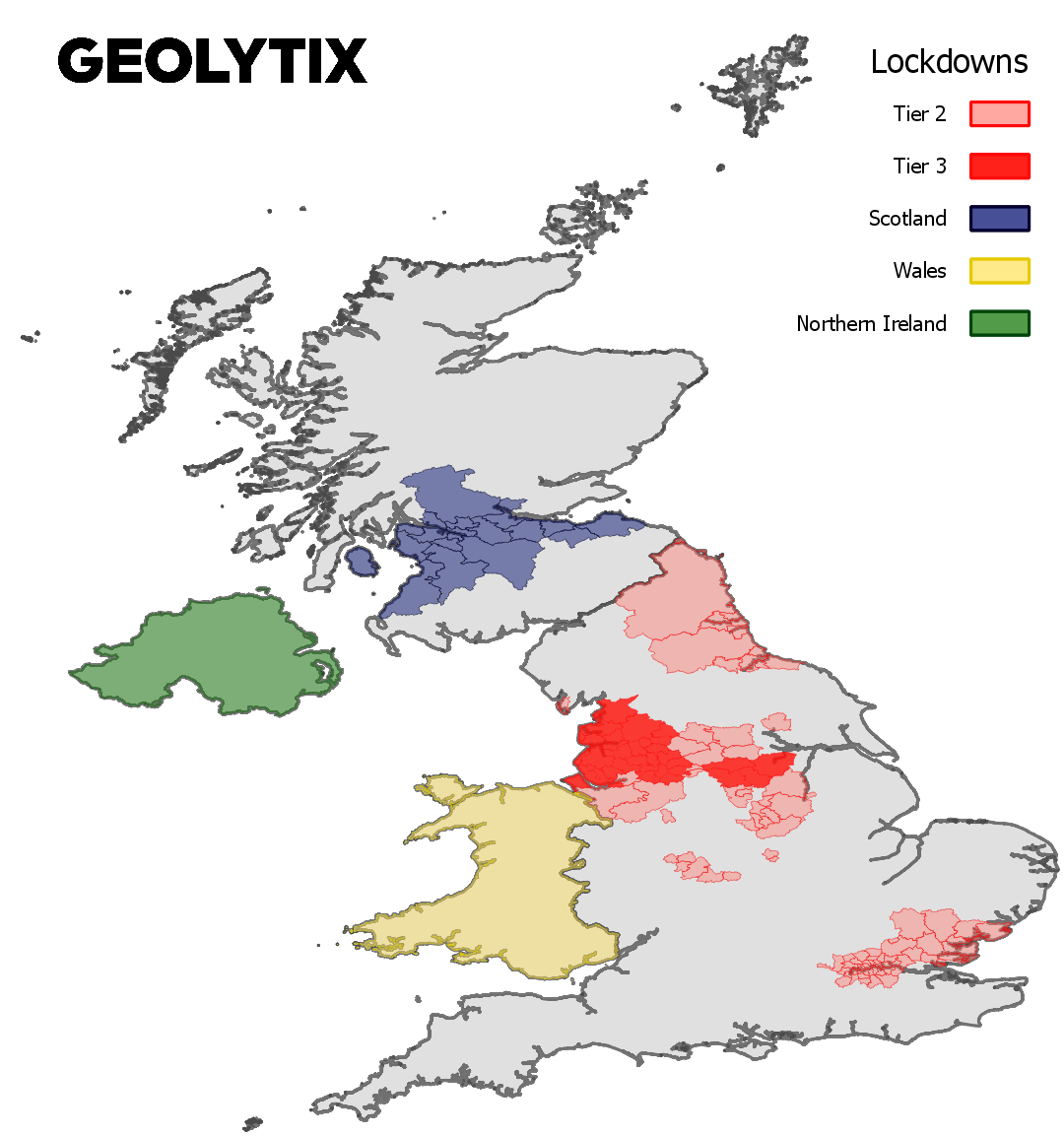 We have used our processed admin boundaries to release a shapefile which includes the boundaries, the admin level of the boundaries and the corresponding tiers. Among many other use cases, this data would be extremely beneficial for retailers that are wanting to highlight which tier each of their store locations fall into and assess the impacts that the different local restrictions might have on their business. There are lots of maps online but not so many with the spatial element which is why we think this would be a helpful open data release for many; you can download here.